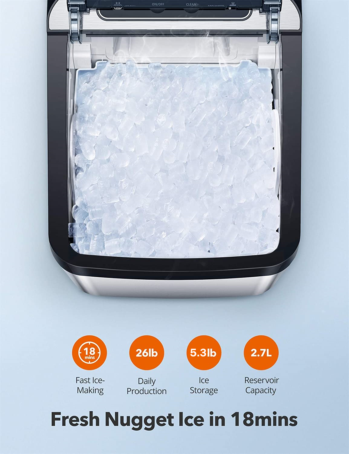 No more waiting hours for ice trays to freeze. The Aicook Nugget Ice Maker begins producing fresh nugget ice in as little as 15 minutes and can generate up to 26 lbs of ice per day.